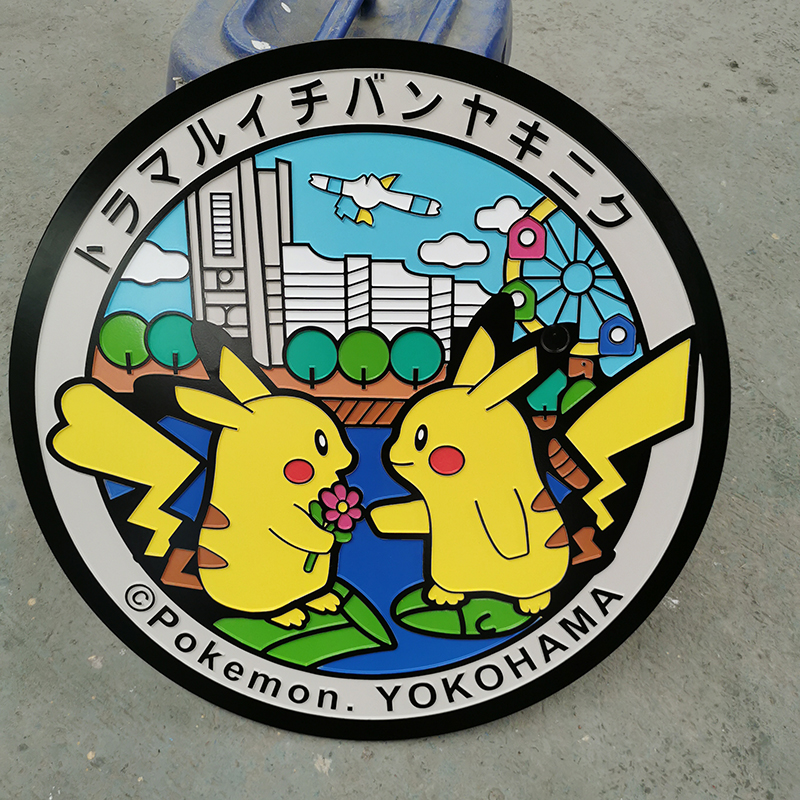 彩色井盖,彩色井盖一般是在铸铁井盖表面或者结合型(铁和铝浮雕、铝底座加铝浮雕),表面涂刷户外耐磨树脂、氟碳等材料,形成表面色彩丰富的图案,通常日本井盖多为铸铁填充树脂的方式,如果定制数量少或者要求图案精细,可以采用井上大师的铝结合型艺术井盖。